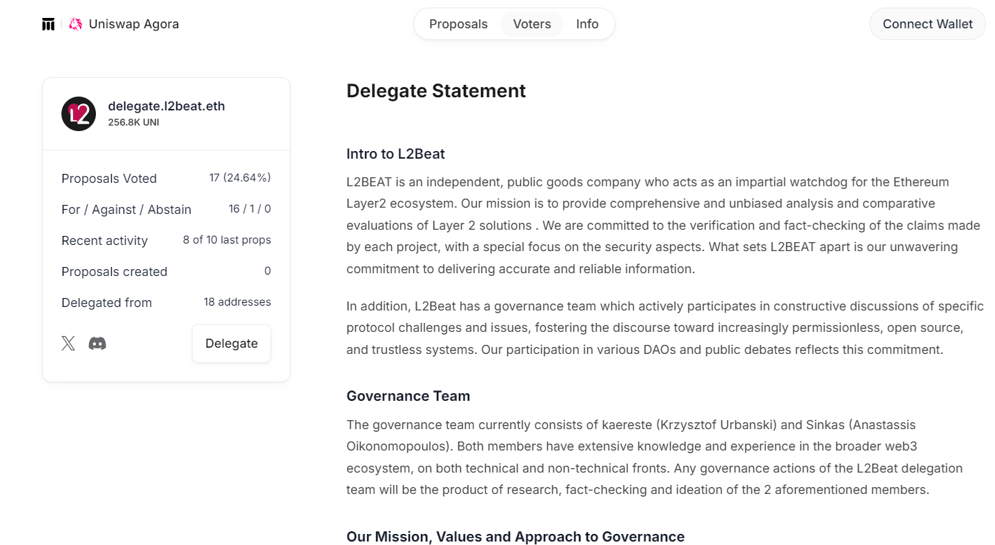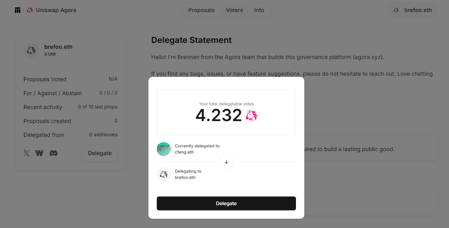 If you are unsure of how best to vote and are interested in delegating your UNI voting power to another party, you can visit the Delegation Pitch section of the Governance Forum. Here parties participating in Uniswap Governance pitch their platform and voting agenda for users to read and discuss.